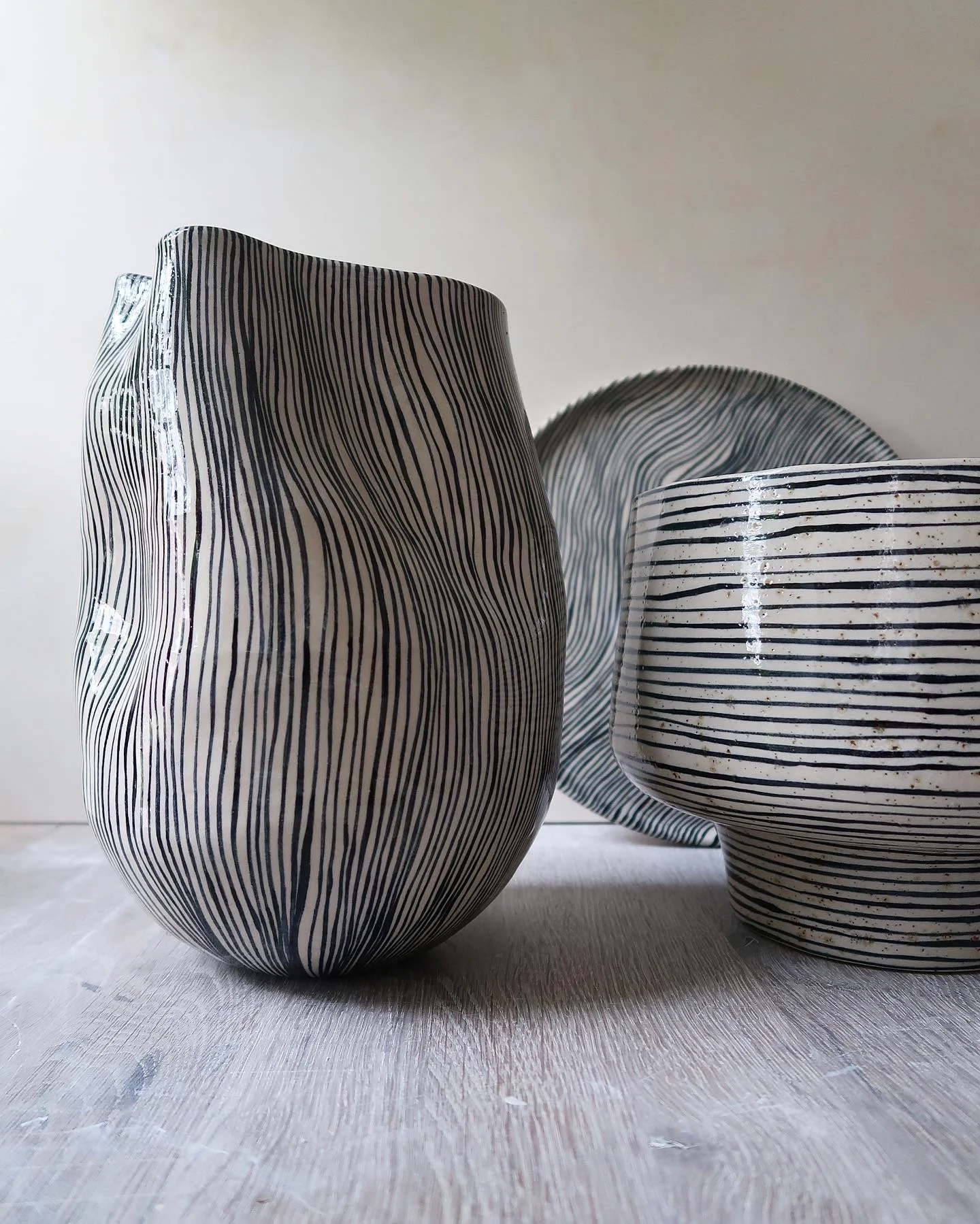Alle Keramiken stelle ich in meinem kleinen Berliner Atelier her. Jedes Stück ist einzigartig in Form, Farbe, Muster, Haptik. Sie alle eint ein aufwendiger Herstellungsprozess, bis sie schlussendlich zu Steinzeug gebrannt werden und somit eine lange Lebensdauer und vor allem Nutzbarkeit aufweisen.